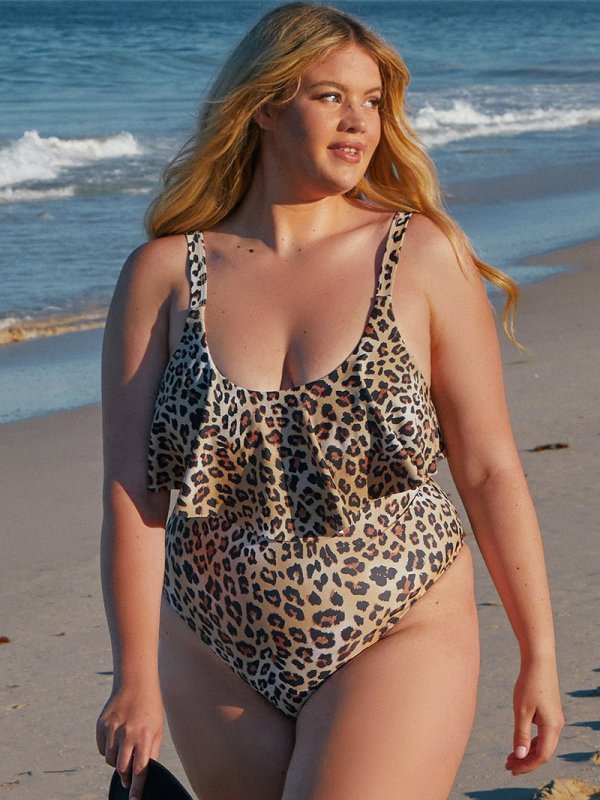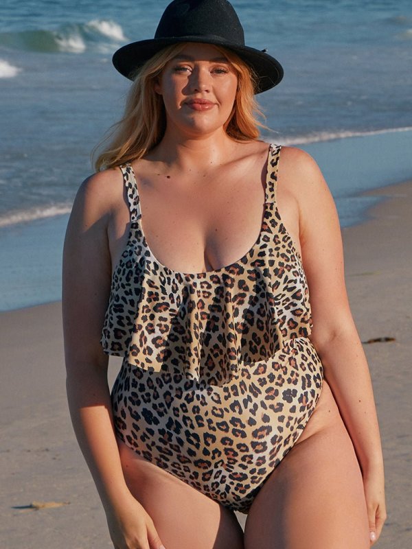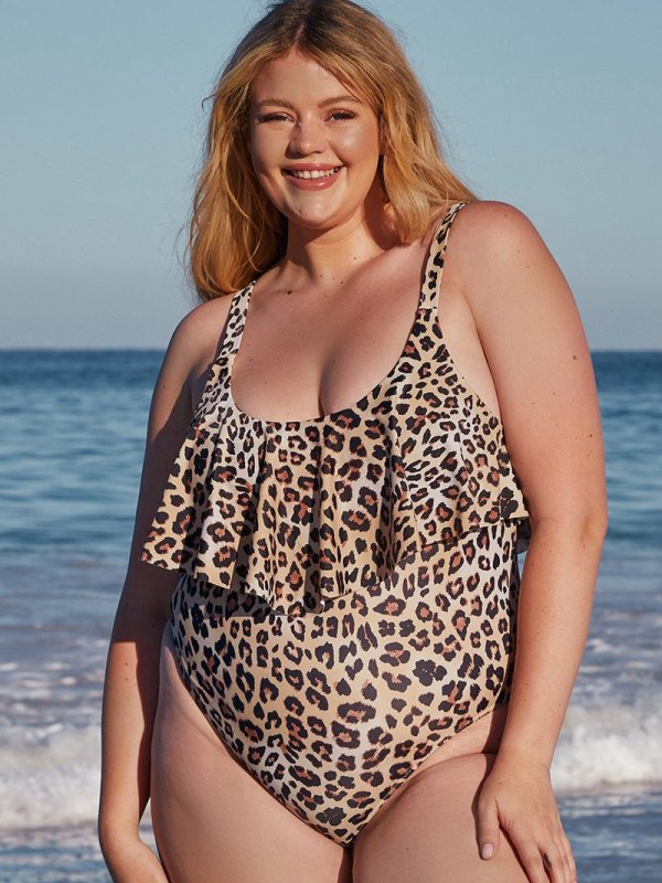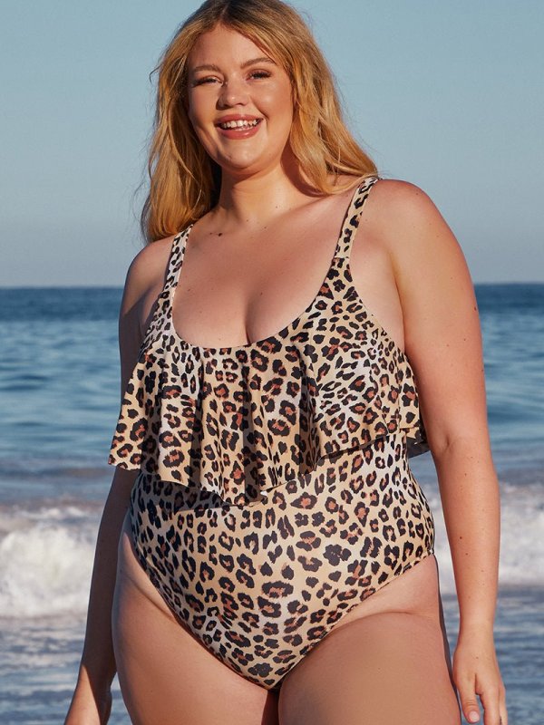 Plus Size Ruffle Leopard Printed Brown One-piece Swimsuit