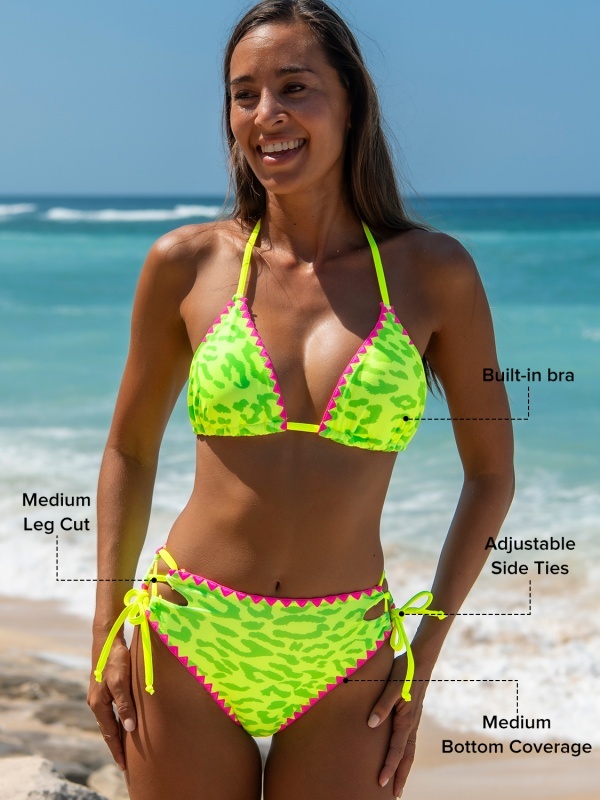 Turn up the heat in this neon leopard bikini set. Designed with a classic triangle halter top and adjustable side-tie bottoms, this set allows for a fully customizable fit while keeping the look bold and playful. The removable soft cups offer light shaping, while the moderate coverage bottom creates a balanced, flattering silhouette. Perfect for beach days, poolside lounging, and tropical escapes.