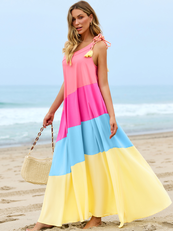 Color Block Sleeveless One Shoulder Maxi Dress
