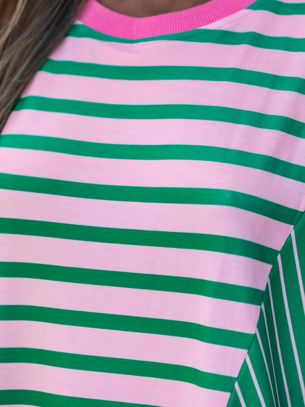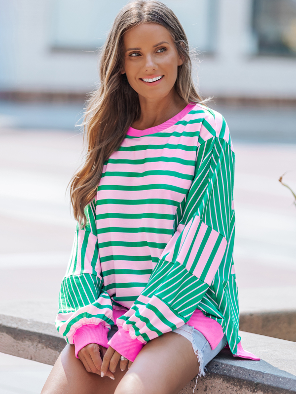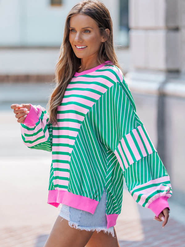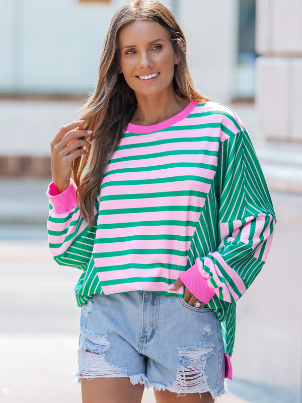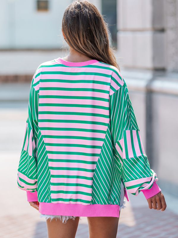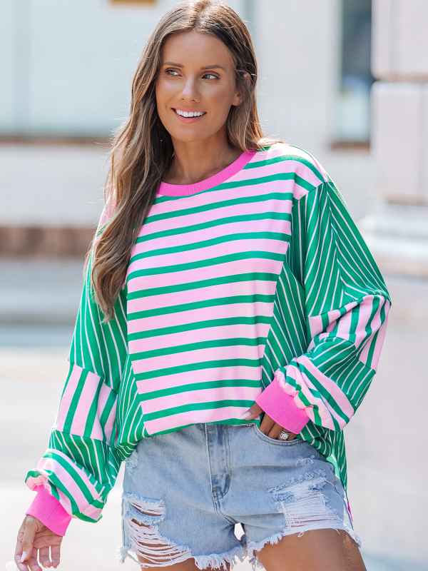 Cotton Blends Casual Striped Batwing Sleeve Patchwork Loose Regular Long Sleeve Round Neck Micro Elasticity Random Printing Daily Sweatshirt