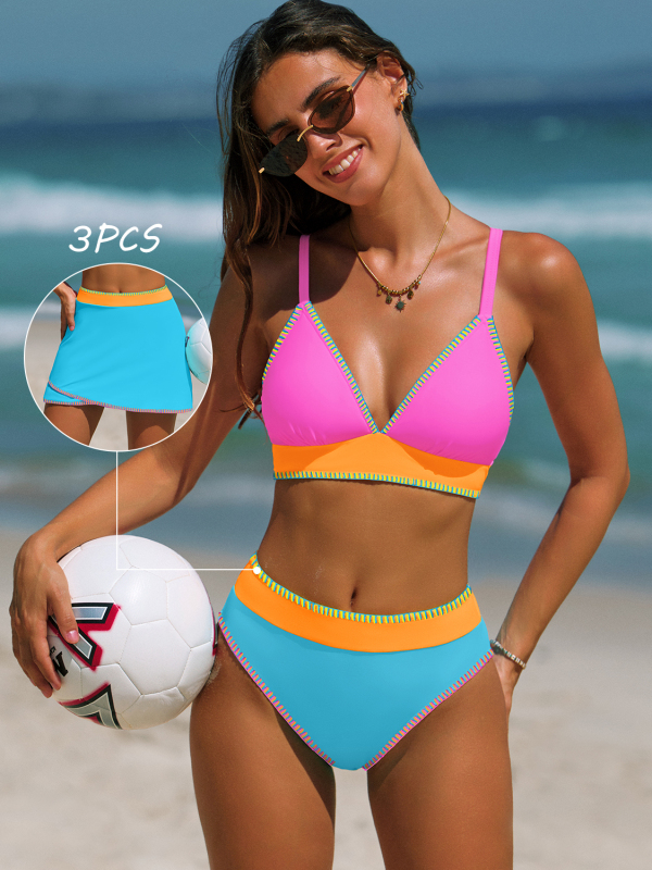 3-Piece Colorblock High-Waist Bikini Set with Skirt