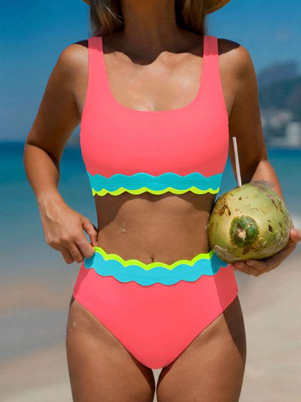 This color-block bikini set features soft scalloped trim for a playful yet balanced look. The scoop-neck top offers comfortable support with adjustable straps, while the high-waisted bottom provides moderate coverage and a smooth, confident fit. Designed for women who appreciate vibrant color with clean, flattering proportions.