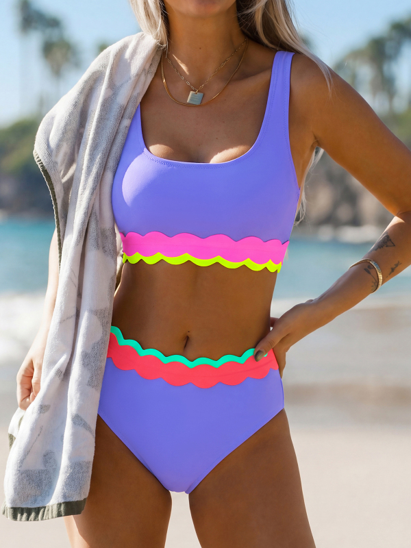 This color-block bikini set features soft scalloped trim for a playful yet polished look. The scoop-neck top provides comfortable support with adjustable straps, while the high-waisted bottom offers moderate coverage and a smooth, flattering fit. Bright contrast colors create a bold summer vibe, making this set perfect for beach days, poolside lounging, and sunny vacations.