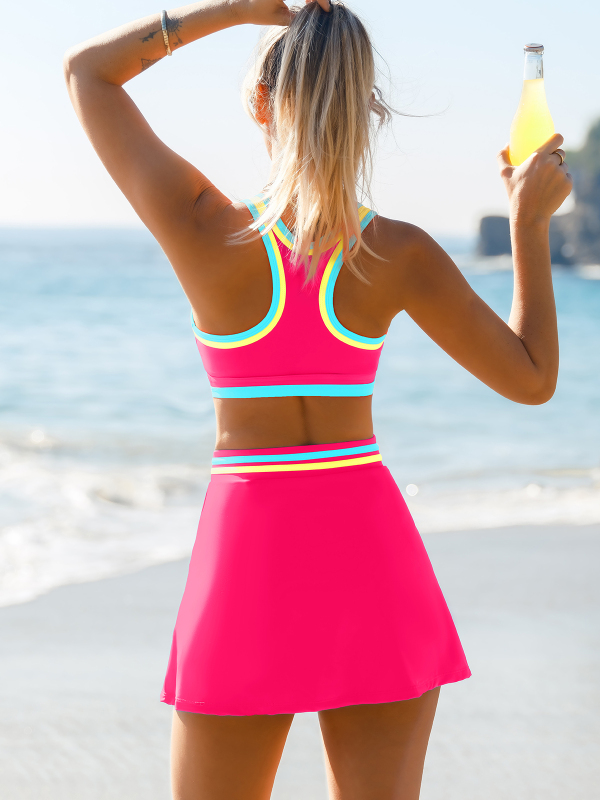 This sporty three-piece swim set features a vibrant color-block design for a bold, energetic look. The V-neck bikini top provides comfortable support with a secure, athletic fit, while the coordinating bottom offers smooth coverage for all-day comfort. The matching swim skirt adds extra coverage and movement, making this set perfect for beach walks, poolside lounging, or active days by the water. Stylish, functional, and easy to wear, it’s designed for women who want both confidence and comfort.